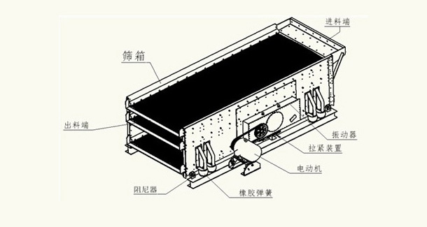 由電機、傳動裝置、激振器、篩箱、橡膠彈簧、底架、阻尼器等構(gòu)成。