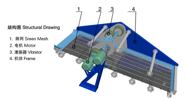 主要由篩箱、篩框、篩網、振動電機、電機臺座、減振彈簧、支架等組成。