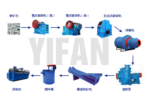 銅礦選礦生產線一般采用比較簡單的流程,經一段磨礦,細度-200網目約占50%~70%,1次粗選,2~3次精選,1~2次掃選。如銅礦物浸染粒度比較細,可考慮采用階段磨選流程。處理斑銅礦的選礦廠,大多采用粗精礦再磨—精選的階段磨選流程,其實質是混合—優(yōu)先浮選流程。先經一段粗磨、粗選、掃選,再將粗精礦再磨再精選得到高品位銅精礦和硫精礦。粗磨細度-200網目約占45%~50%,再磨細度-200網目約占90%~95%。 銅礦選礦流程分為三部分: 1.破碎部分:粉碎礦石過程的基本過程。其目的是原礦粉碎到適當大小,適合用于研磨一部分。? 2.研磨部分:研磨粉碎部分進一步處理礦石得到更小的尺寸是為配合浮選分離材料? 3.浮選部分:浮選過程/升級銅礦的重要過程。化學試劑將被添加到混頻器/攪拌機,使化學反應。 開采的礦石先由顎式破碎機進行初步破碎,在破碎至合理細度后經由提升機、給料機均勻送入球磨機,由球磨機對礦石進行破碎、研磨。 經過球磨機研磨的礦石細料進入下一道工序:分級。螺旋分級機借助固體顆粒的比重不同而在液體中沉淀的速度不同的原理,對礦石混合物進行洗凈、分級。經過洗凈和分級的礦物混合料在經過磁選機時,由于各種礦物的比磁化系數不同,經由磁力和機械力將混合料中的磁性物質分離開來。經過磁選機初步分離后的礦物顆粒在被送入浮選機,根據不同的礦物特性加入不同的藥物,使得所要的礦物質與其他物質分離開。 在所要的礦物質被分離出來后,因其含有大量水分,須經濃縮機的初步濃縮,再經烘干機烘干,即可得到干燥的礦物質。銅精粉品位達到45%。