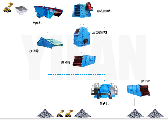 首先從山上爆破下來的石頭通過喂料機均勻地喂入顎式破碎機初步破碎,經粗碎后的半成品通過皮帶輸送機輸送至反擊式破碎機進一步破碎,二次破碎后的石料通過皮帶輸送機輸送至振動篩篩分出不同規格的石子,滿足客戶粒度要求的石子通過皮帶輸送機輸送至成品料堆,大于上層篩網尺寸的石子通過皮帶輸送機重新返回至反擊式破碎機再次破碎,形成閉路循環。
