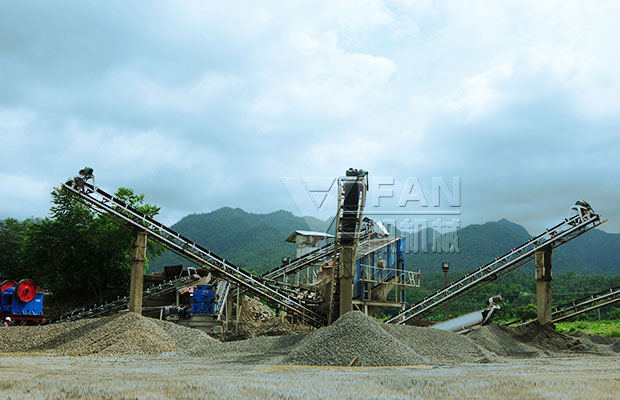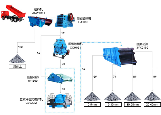 我國(guó)河卵石資源眾多,因地而異。因此在配置設(shè)備時(shí),要把方案的耐磨性性放在主要位置。粒度大的可參考花崗巖與玄武巖的破碎;粒度小的需進(jìn)行預(yù)篩分,以降低生產(chǎn)成本; 以200mm以下河卵石為例:物料在原料倉(cāng)經(jīng)由給料機(jī)、皮帶機(jī)輸送至1#振動(dòng)篩進(jìn)行預(yù)篩分,大于40mm的物料進(jìn)入圓錐破進(jìn)行破碎,5-40mm的進(jìn)入立式?jīng)_擊破碎機(jī)進(jìn)行破碎,0-5mm的進(jìn)入洗砂機(jī)清洗后直接出成品。圓錐破破碎后的產(chǎn)品上2#振動(dòng)篩篩分,大于40mm的返回圓錐破重新破碎,形成閉路循環(huán),小于40mm的進(jìn)入立式?jīng)_擊破破碎。立式?jīng)_擊破出來(lái)的料上3#振動(dòng)篩篩分,大于20mm的返回立式?jīng)_擊破進(jìn)行破碎,形成閉路循環(huán),小于20mm的物料經(jīng)由皮帶機(jī)輸送至成品料堆,根據(jù)原料的潔凈程度可考慮將0-5mm的物料送至洗砂機(jī)清洗。